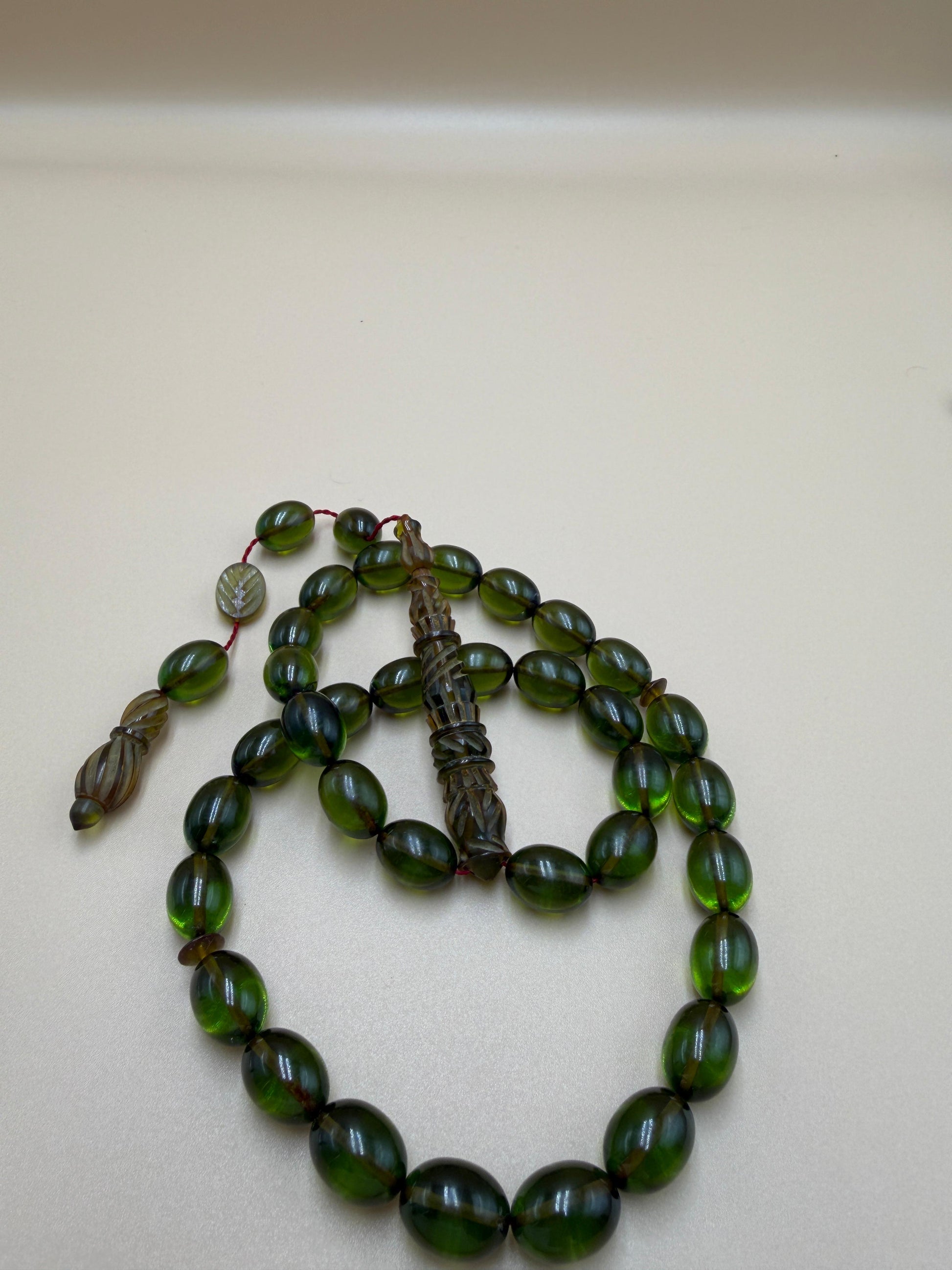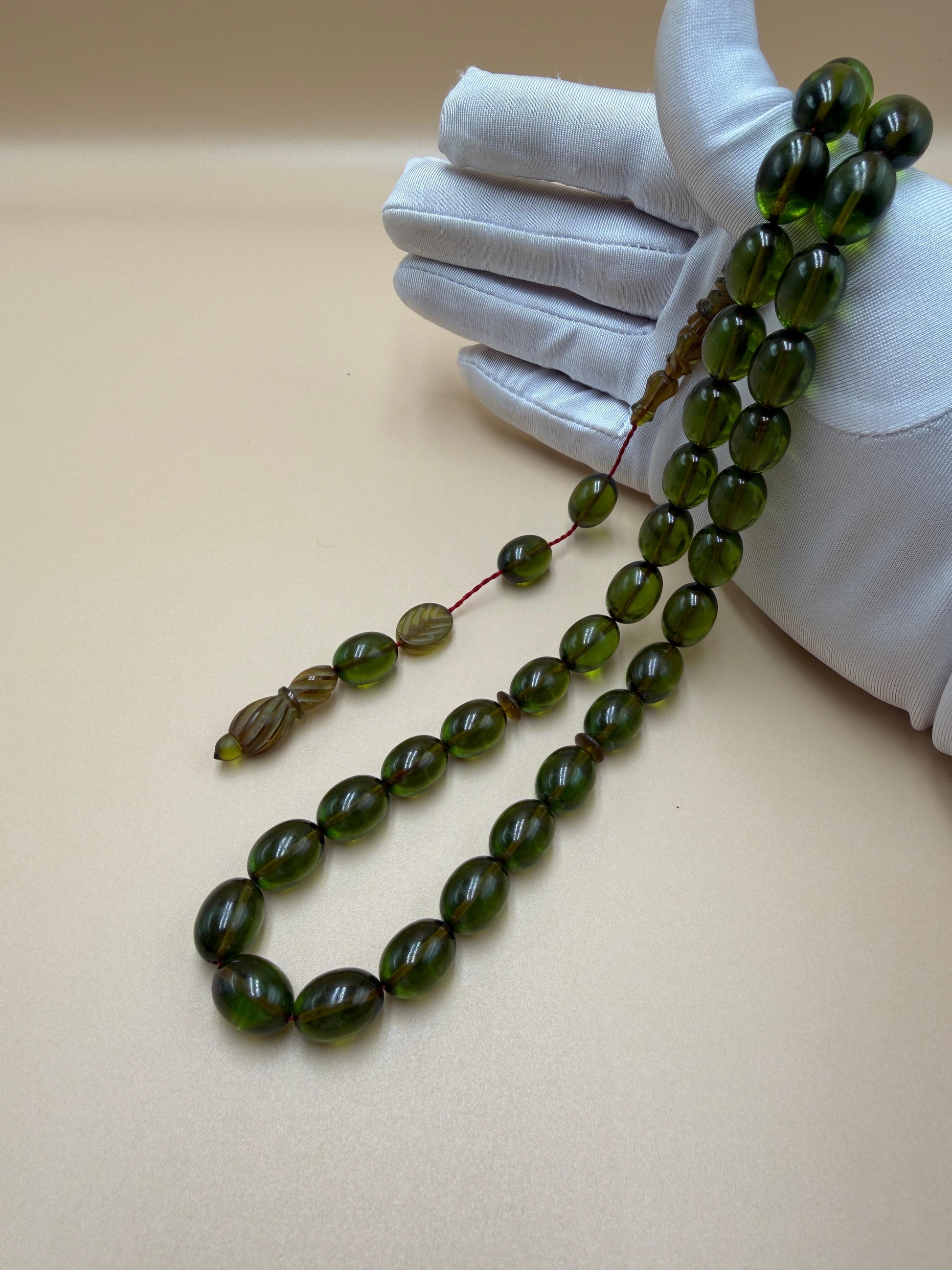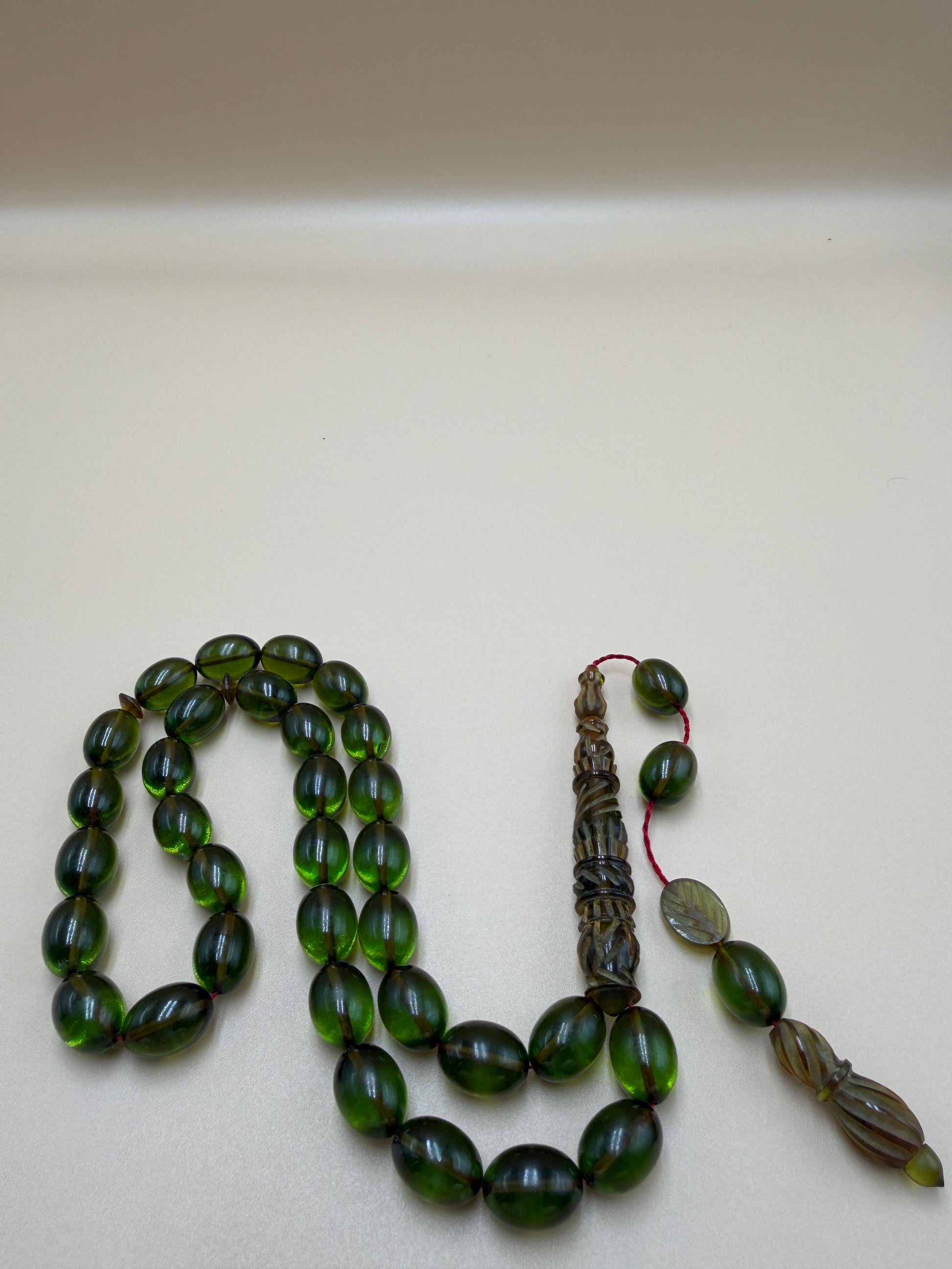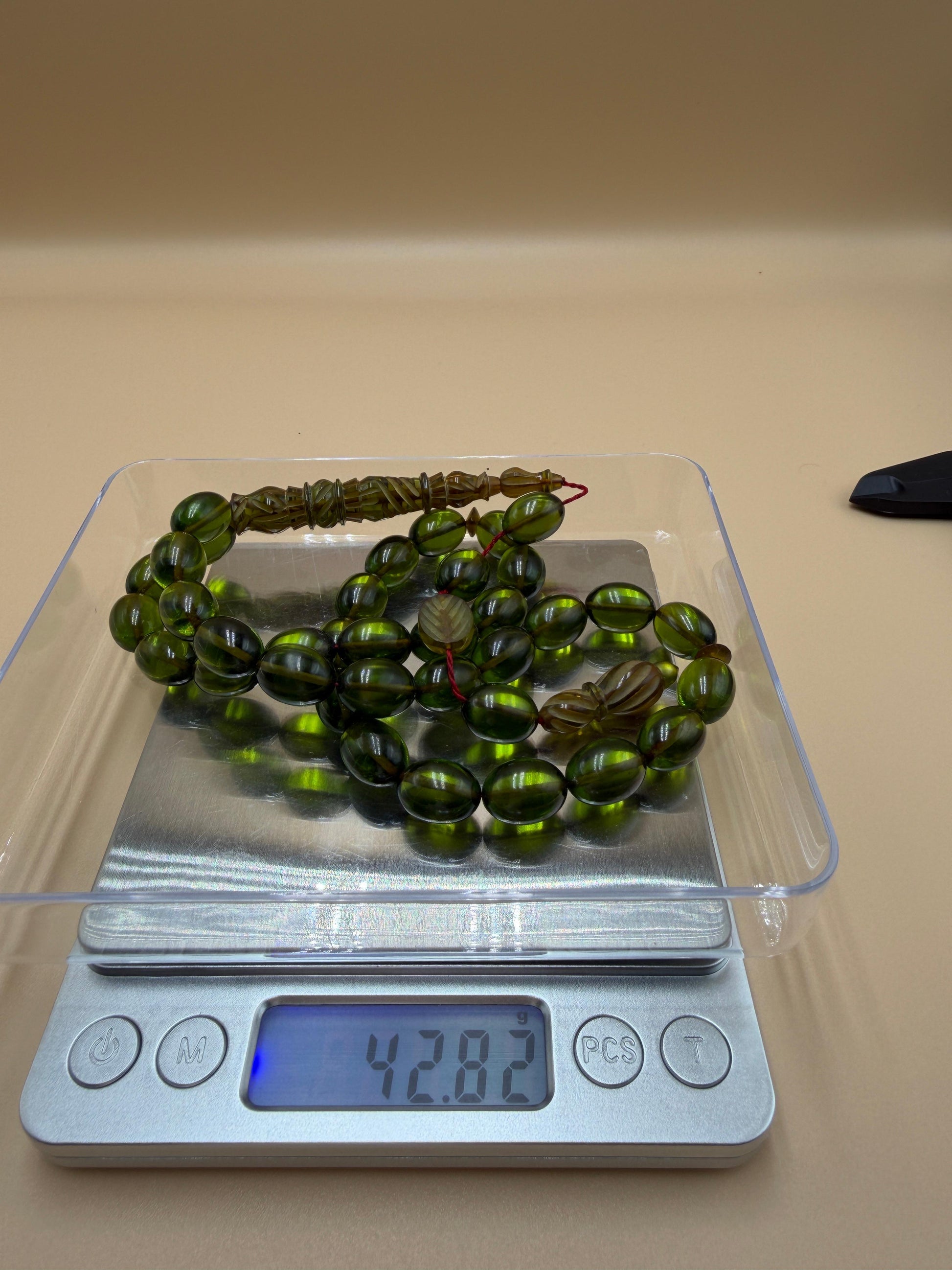 مسباح سندلوس شفاف نفطي، مع شاهد مميّز منقوش. Transparent Oily Sandalwood Misbah with a Distinctively Engraved Marker.