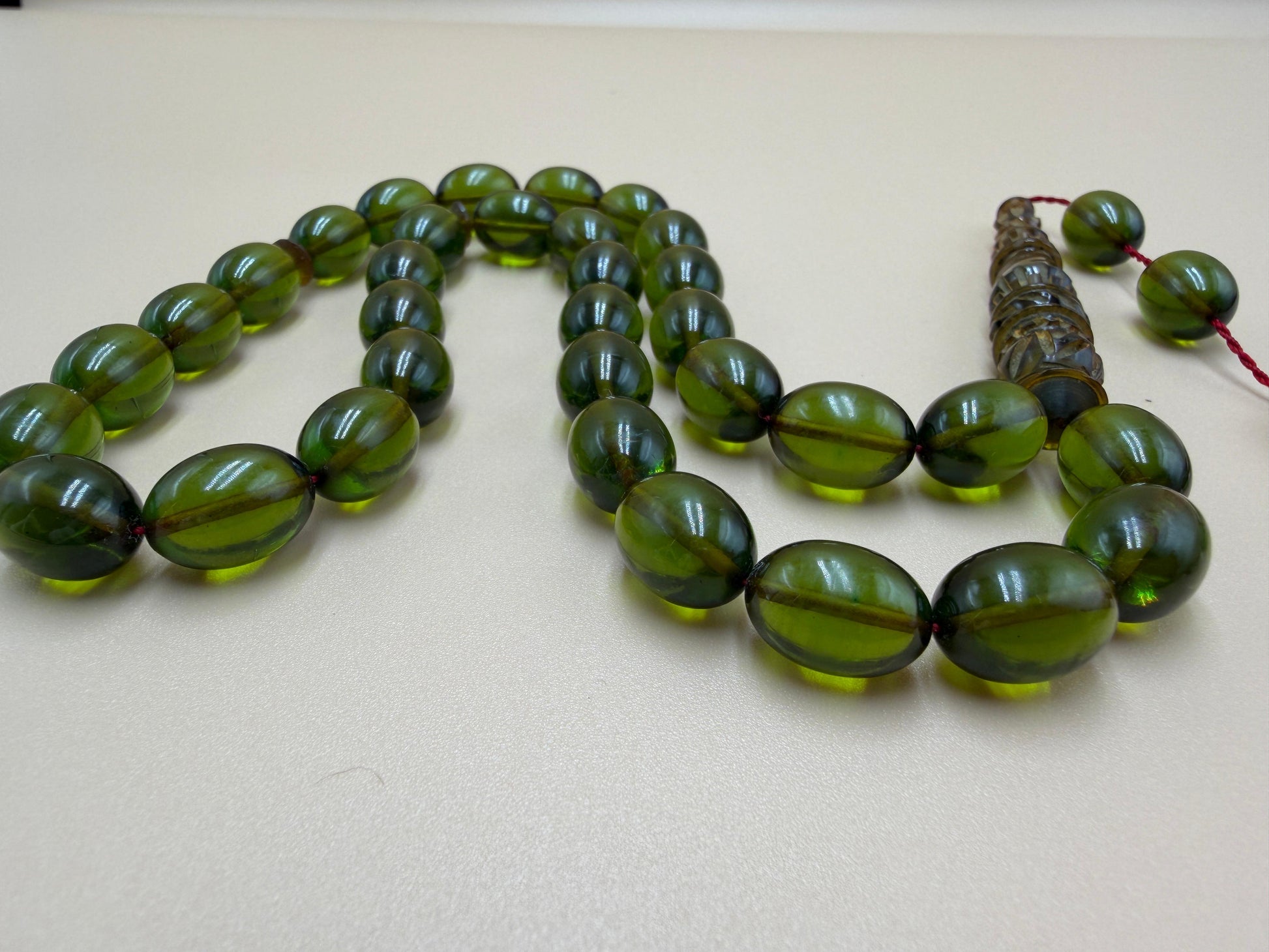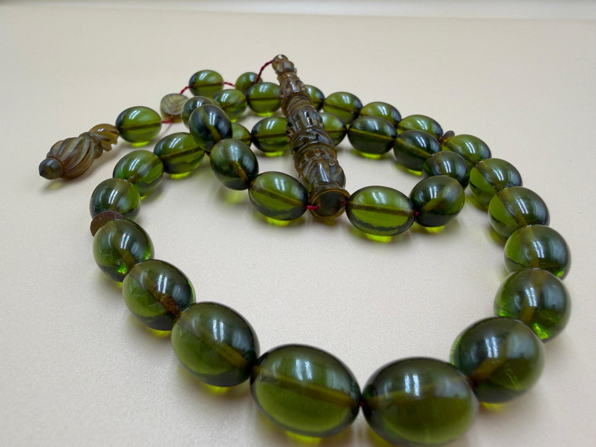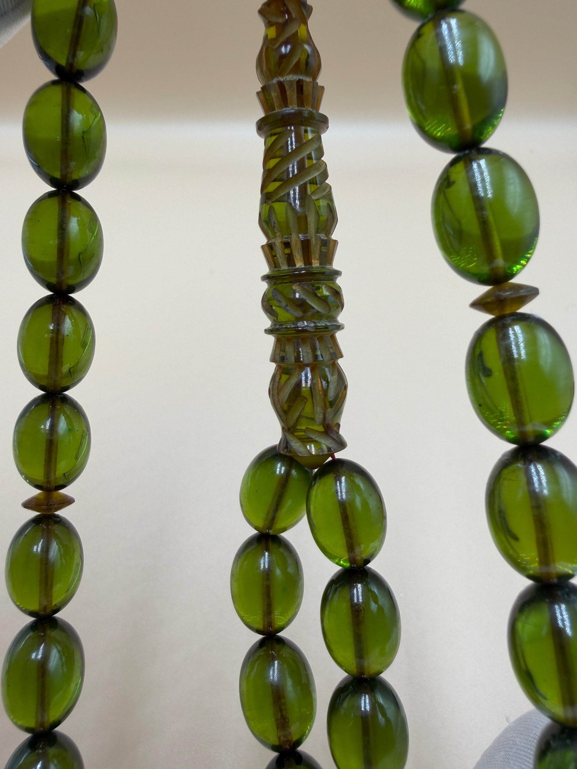 مسباح سندلوس شفاف نفطي، مع شاهد مميّز منقوش. Transparent Oily Sandalwood Misbah with a Distinctively Engraved Marker.