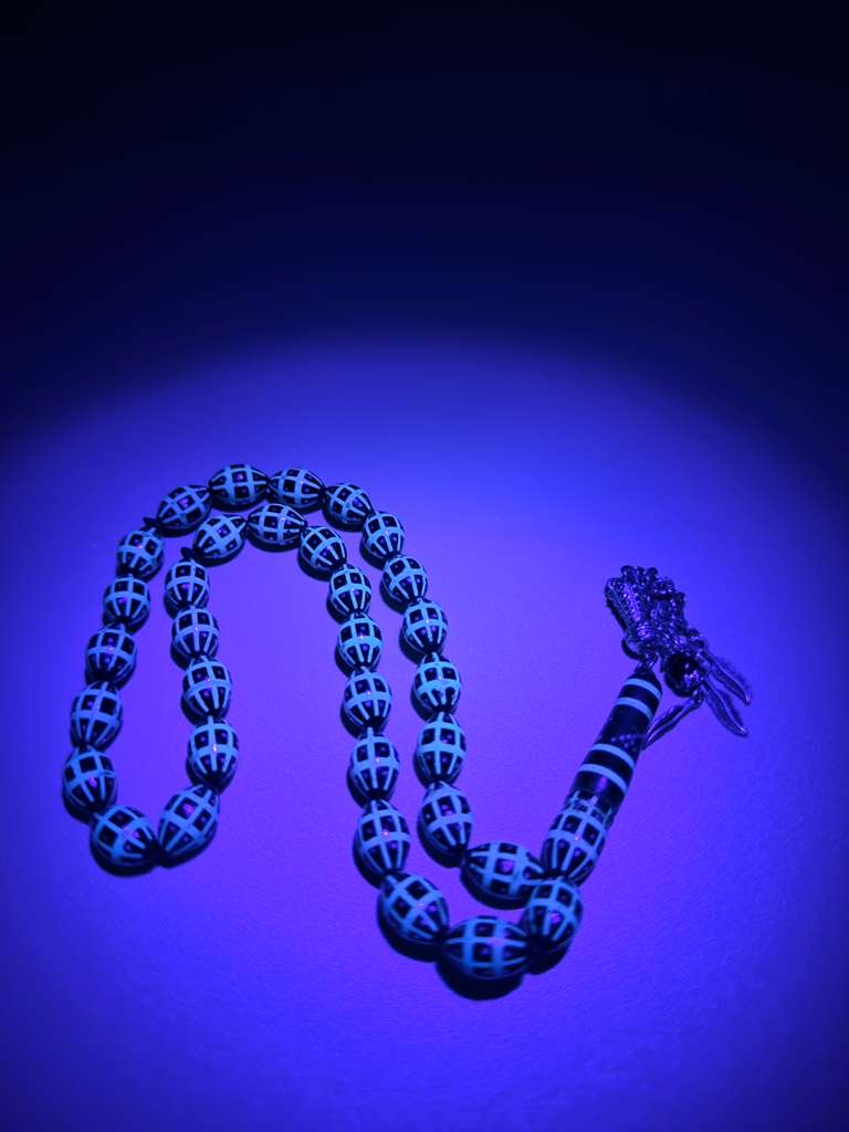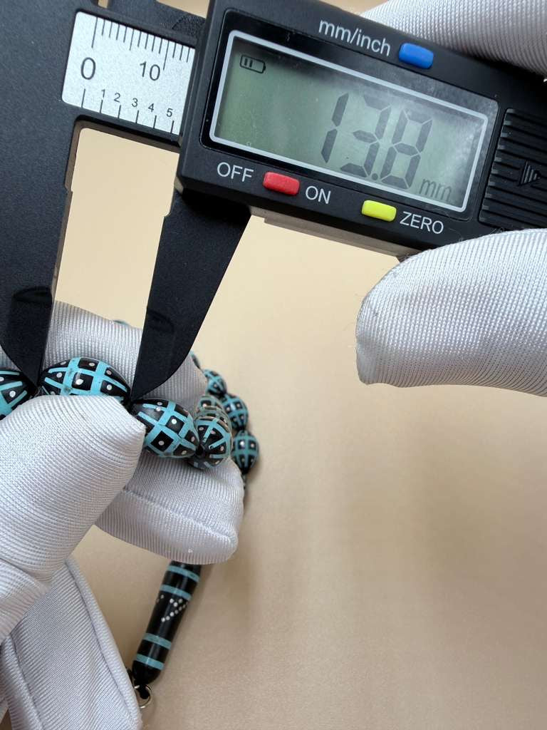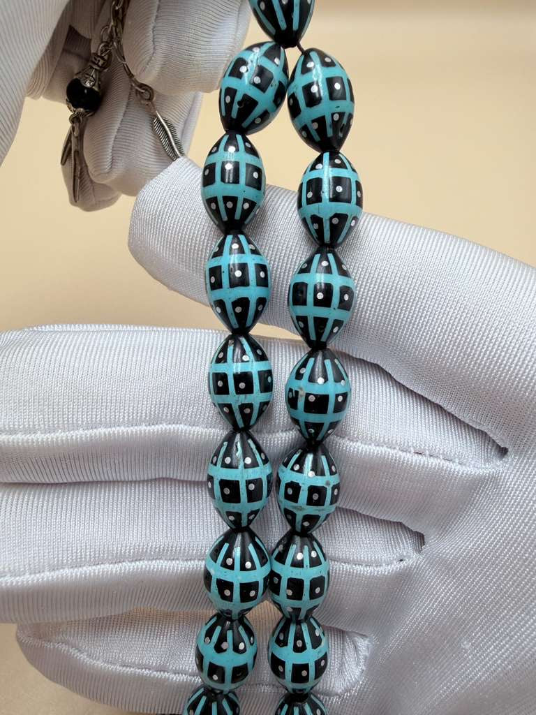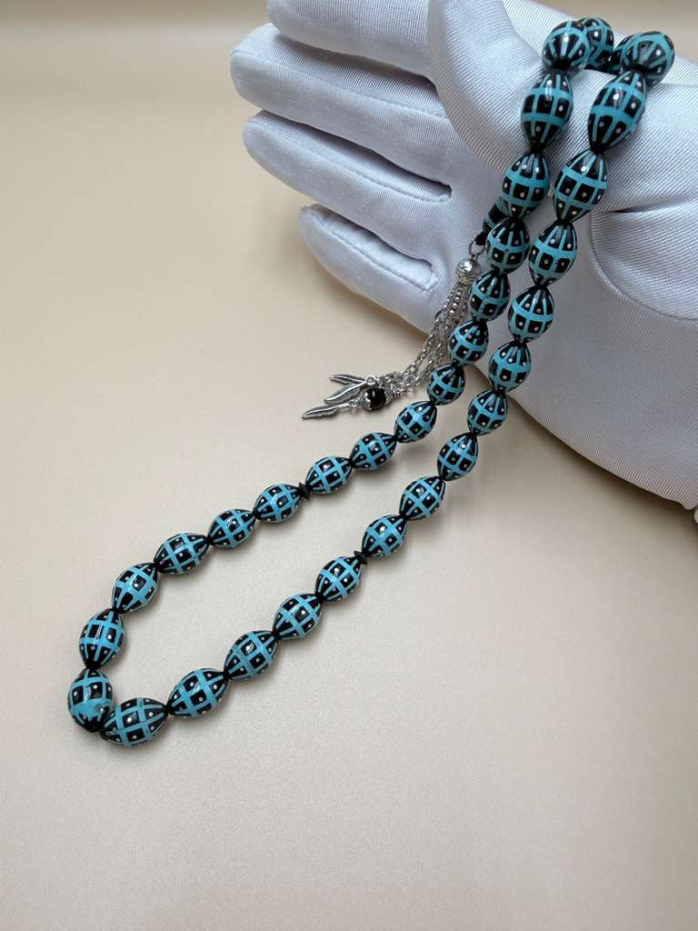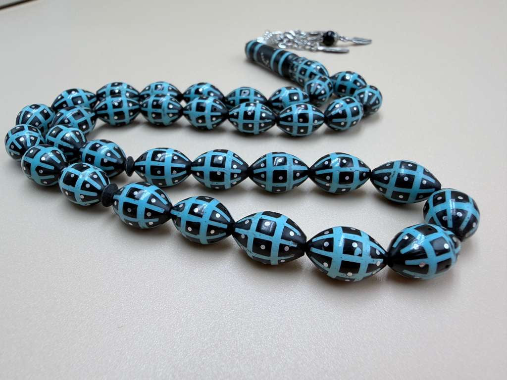 مسباح كوك، مطعّم قصدير وتراب حجر الفيروز. Kuka Wood Misbah, Inlaid with Tin and Turquoise Stone Powder.
