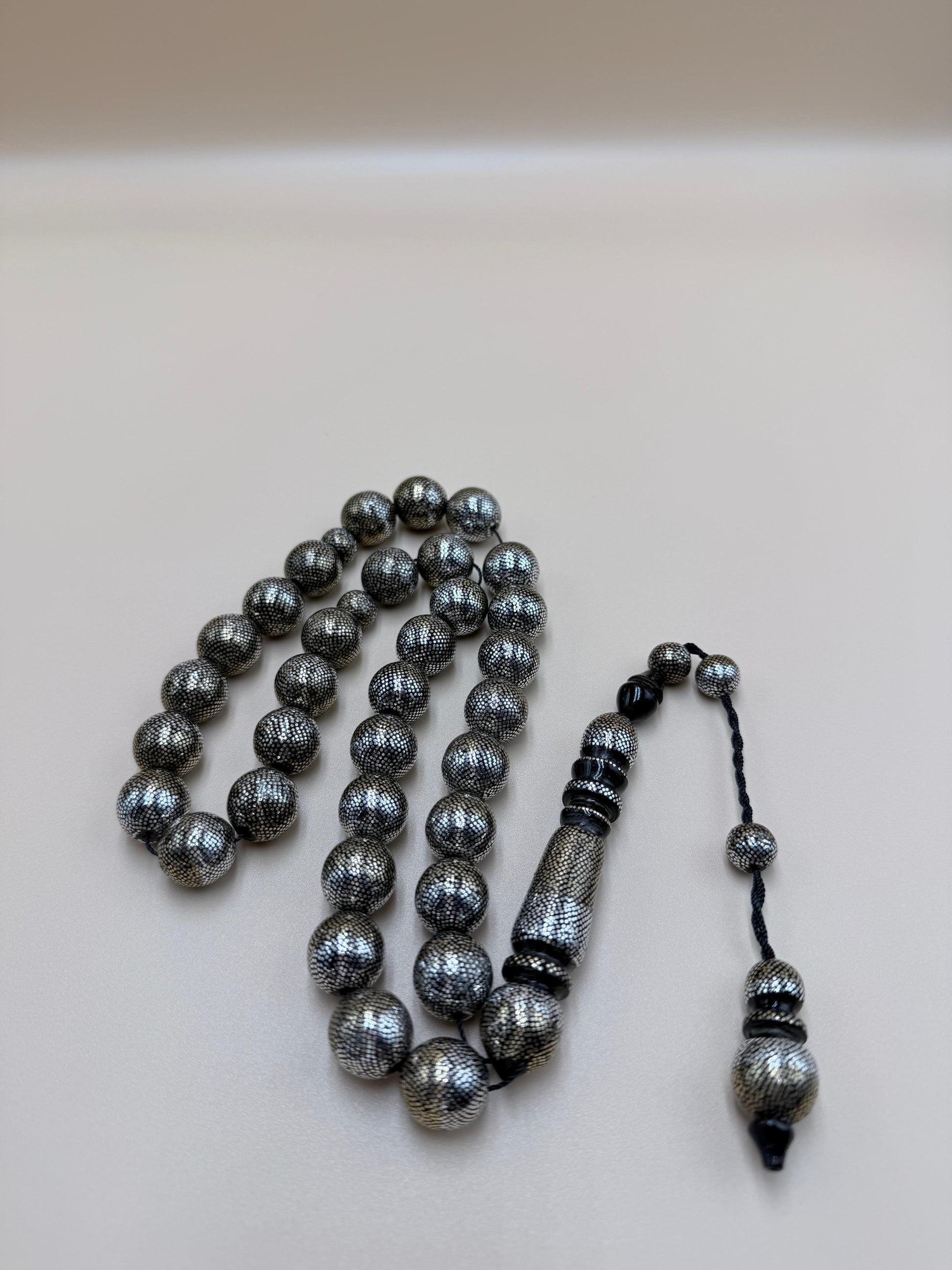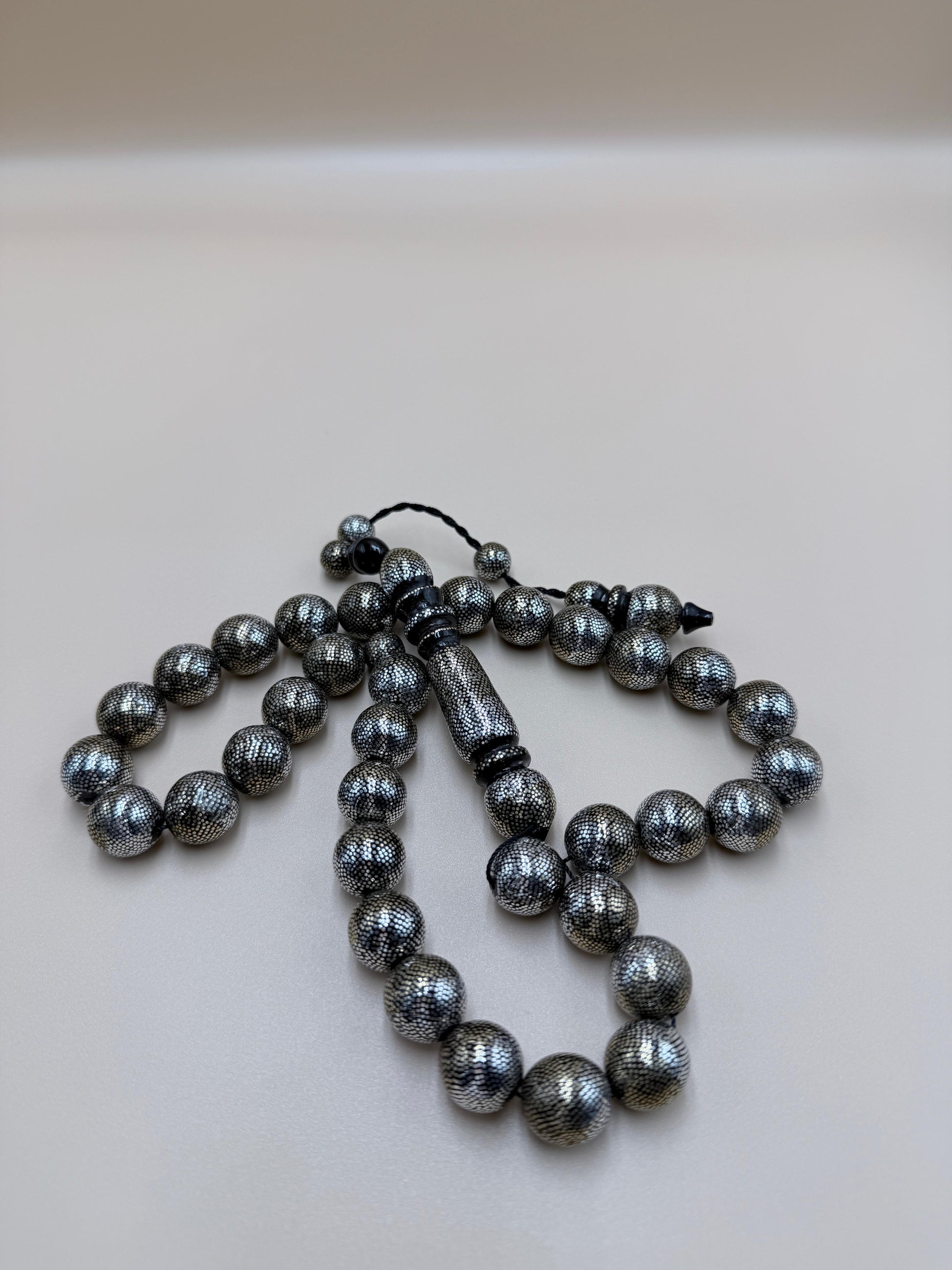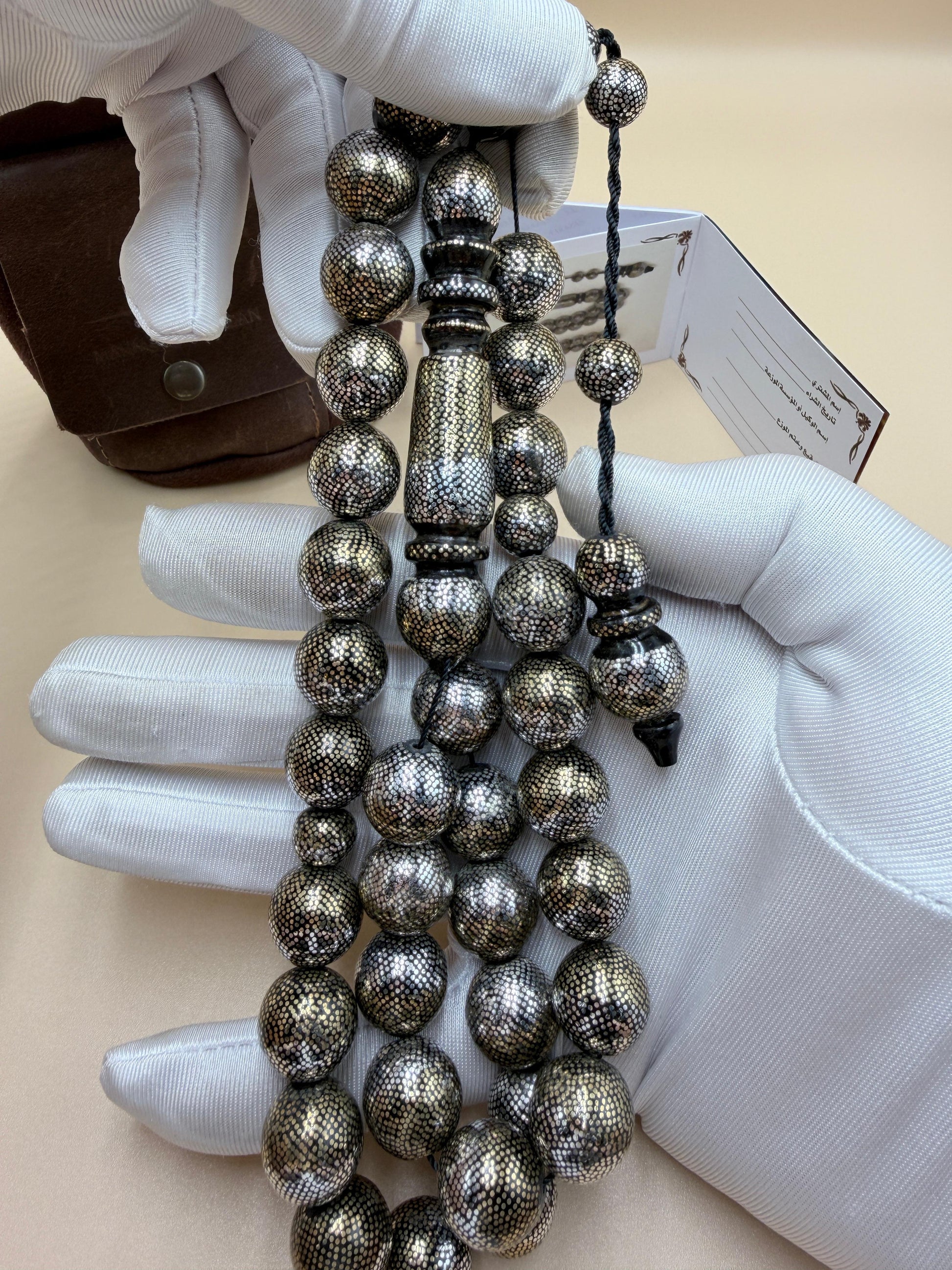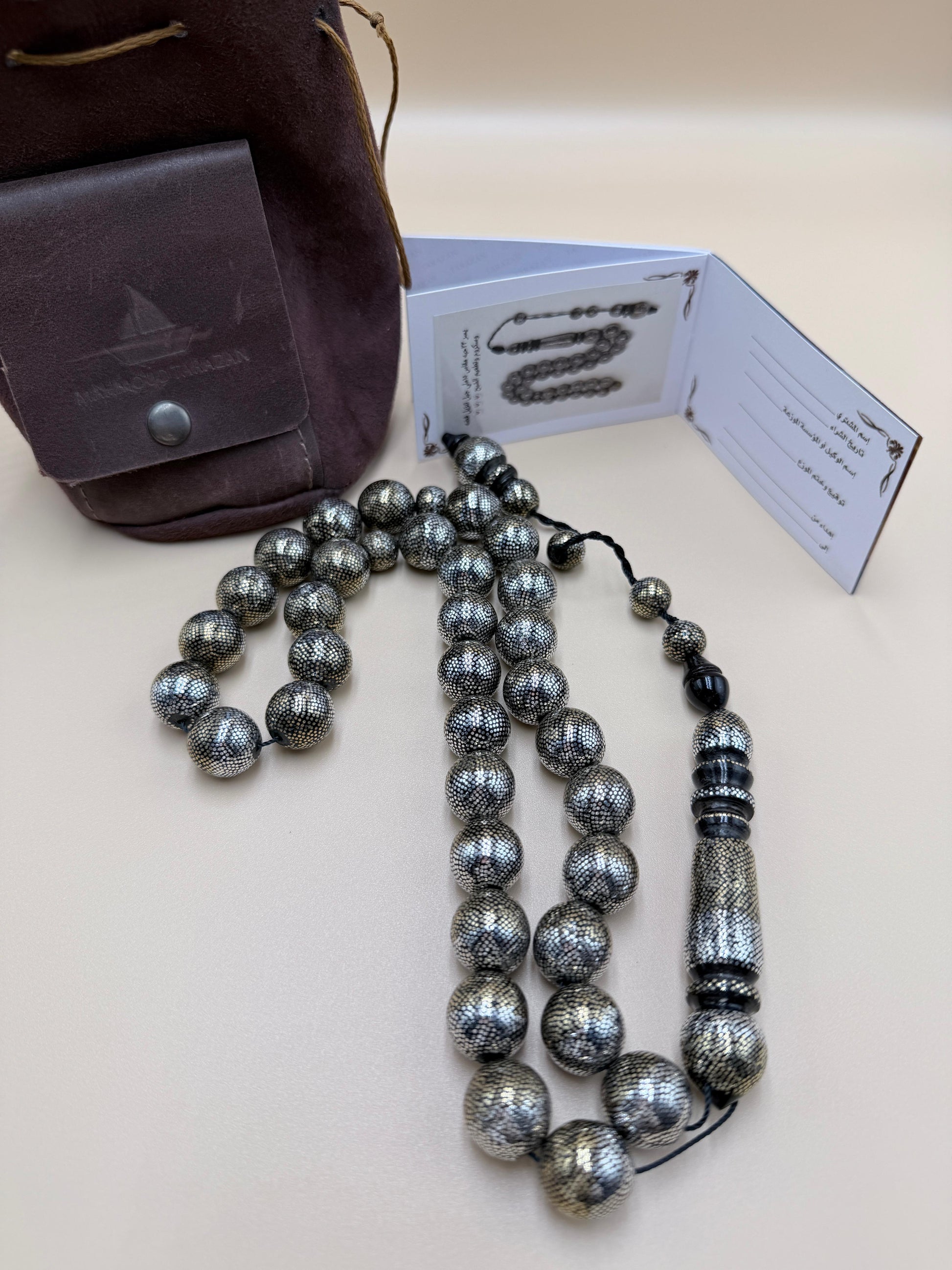 مسباح محمود طرزان – يسر بحر أحمر بتطعيم فضّة وسكروم، إصدار الشبح. Mahmoud Tarzan rosary – Red Sea Yusr, inlaid with silver and scrom, Phantom edition.