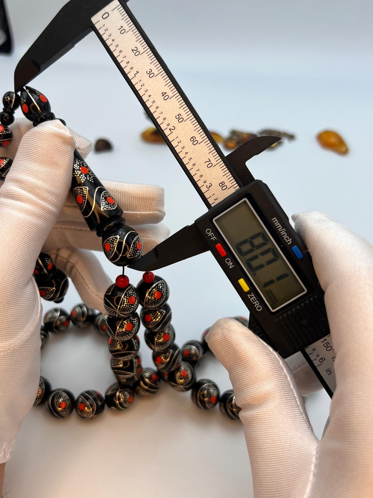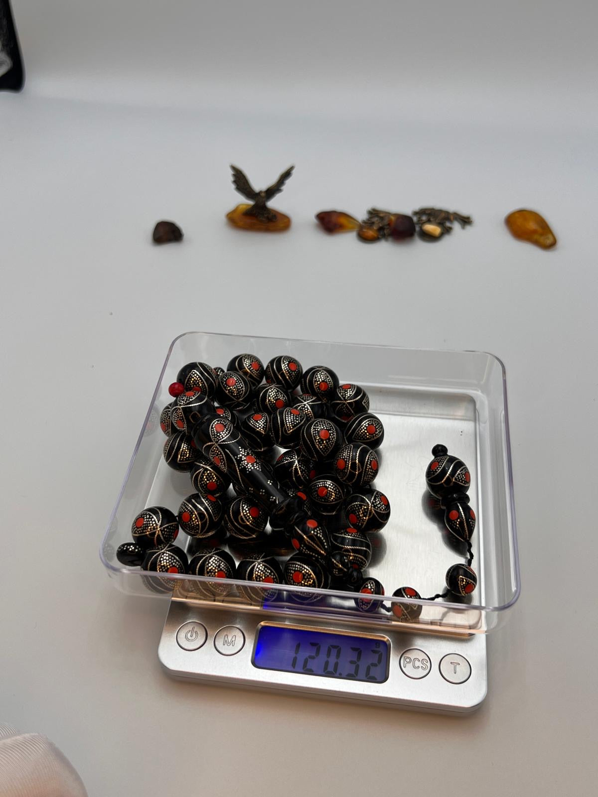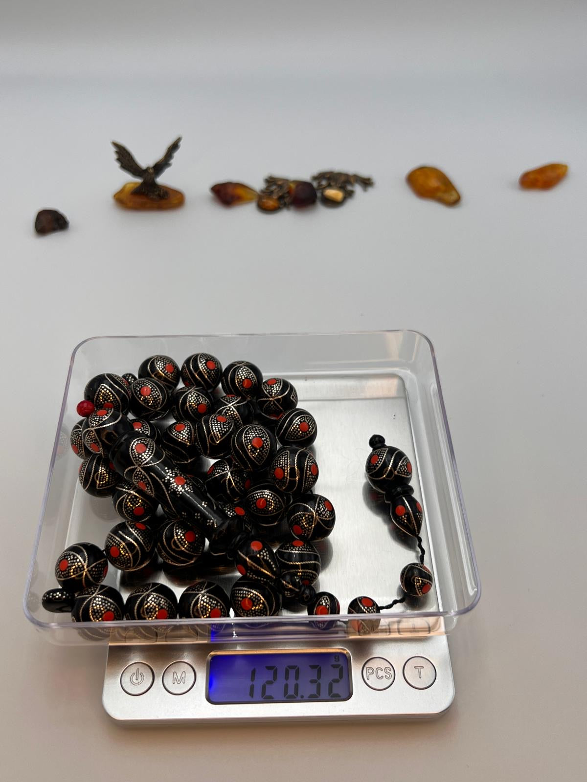 يسر بحر احمر حجم جامبو تطعيم فضة و مرجان Jumbo Red Sea Yusr Misbaha, inlaid with silver and accented with natural coral spacers.