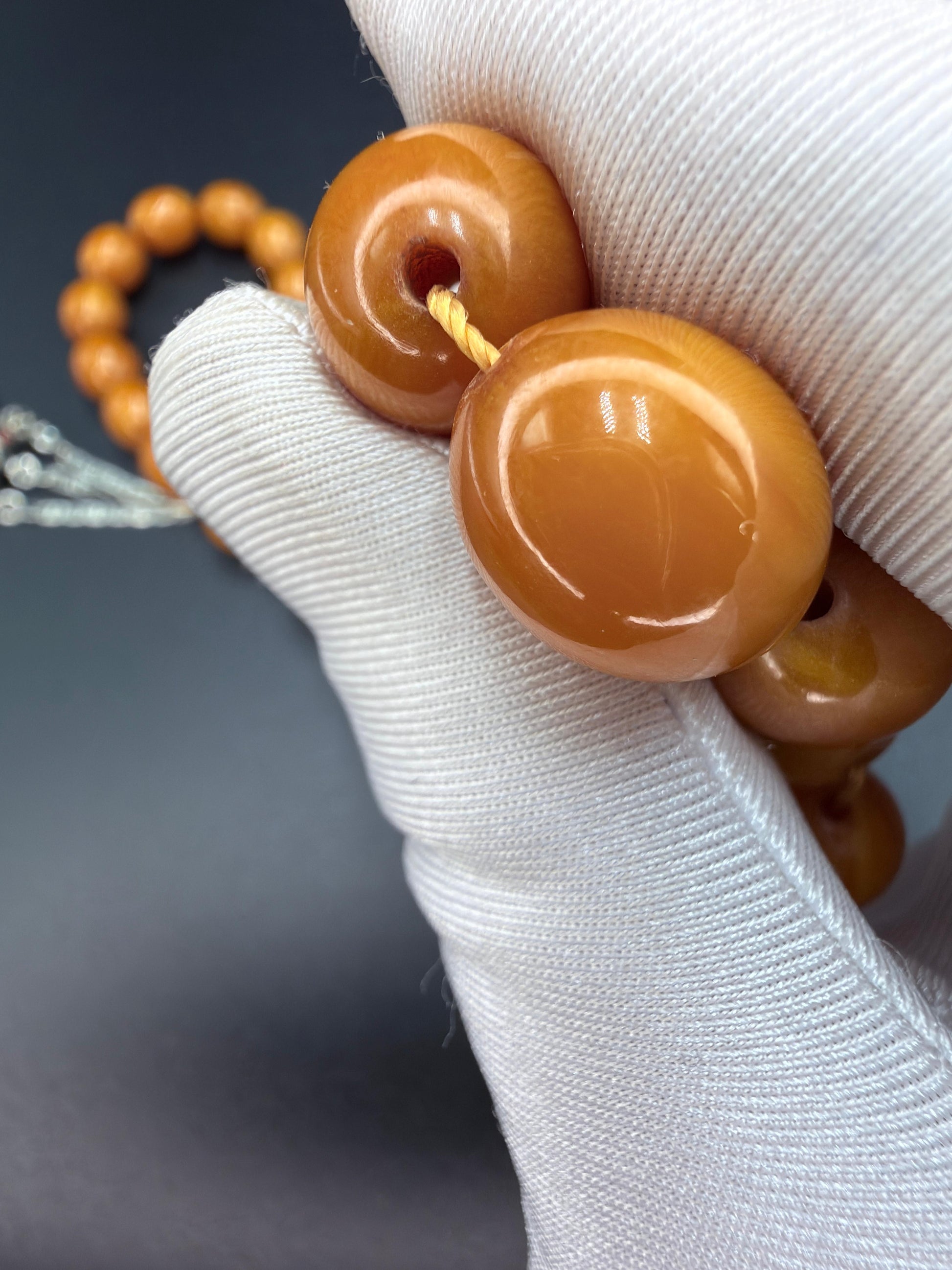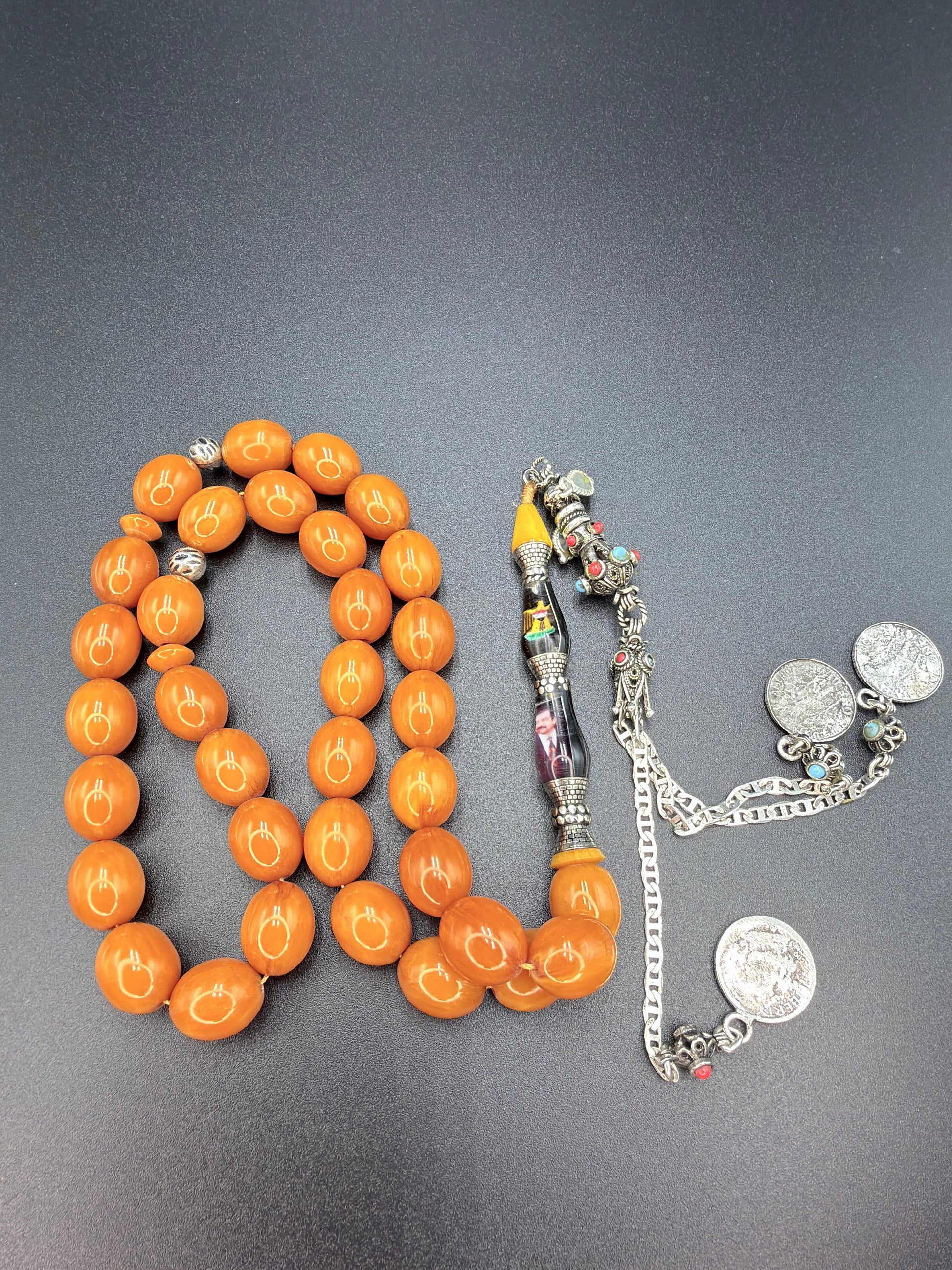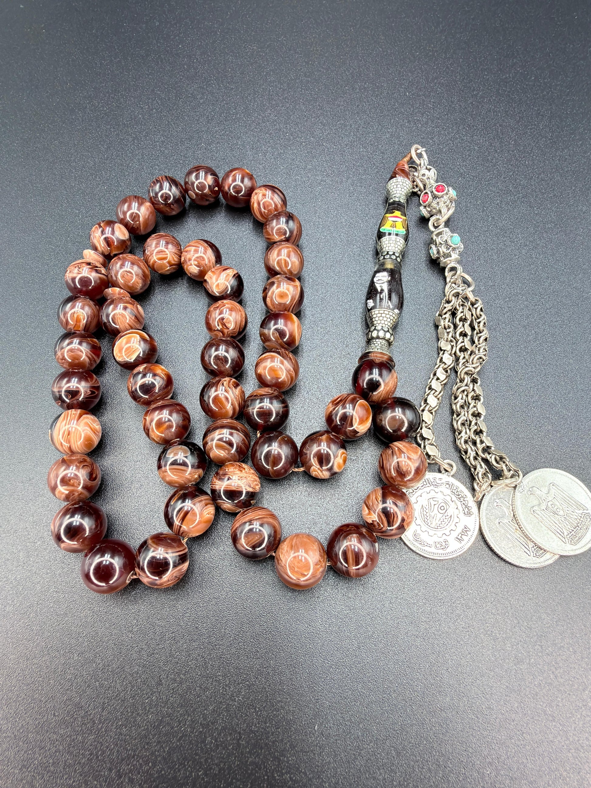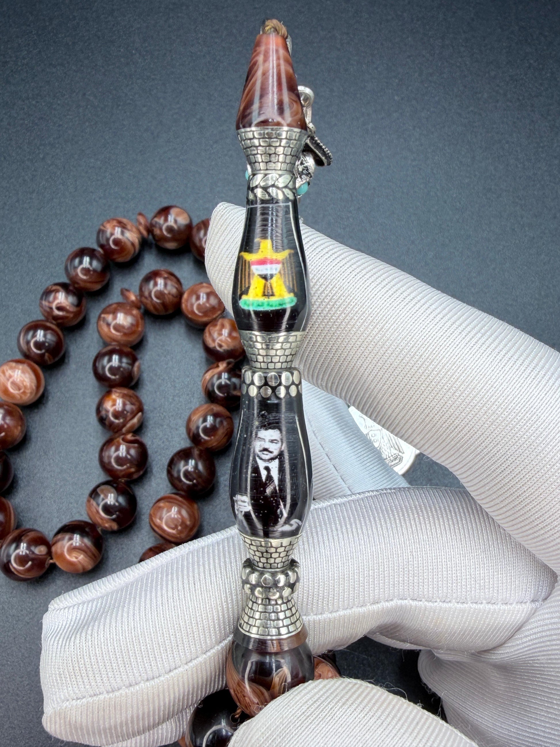 Unique musk Misbaha featuring the image of Saddam Hussein and the Iraqi national anthem, paired with a 500-grade silver tassel. مسباح مسكي مميّز يحمل صورة صدام حسين والسلام الجمهوري، مرفق بشرّابة فضّة عيار 500