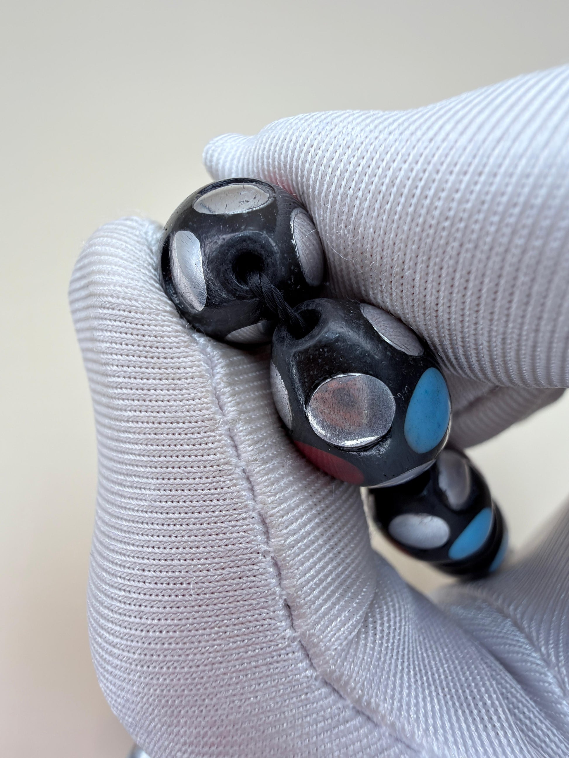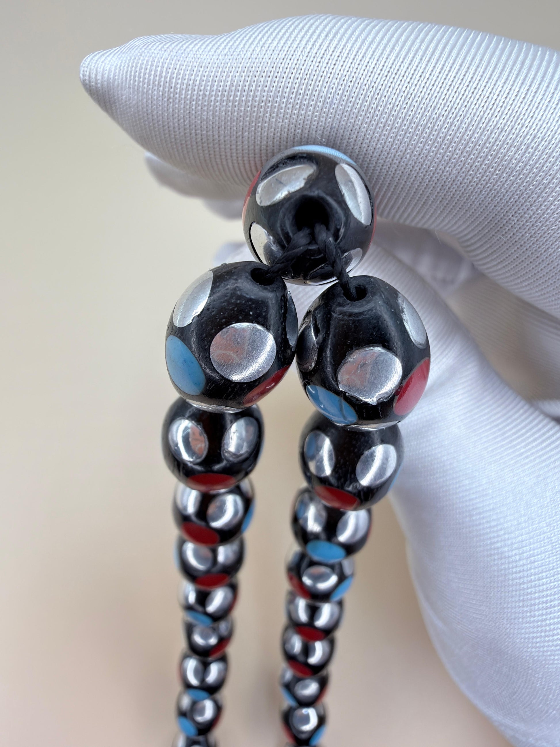 مسباح كوك قديم بتطعيم نحاس ومينا مع أحجارفيروز ومرجان Vintage Koka Misbaha, inlaid with brass and enamel, featuring Turquoise and Coral stones.
